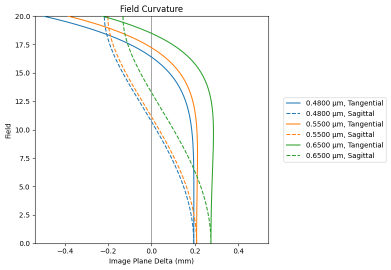 Visualizes the Petzval surface and the separation between sagittal and tangential focal planes.