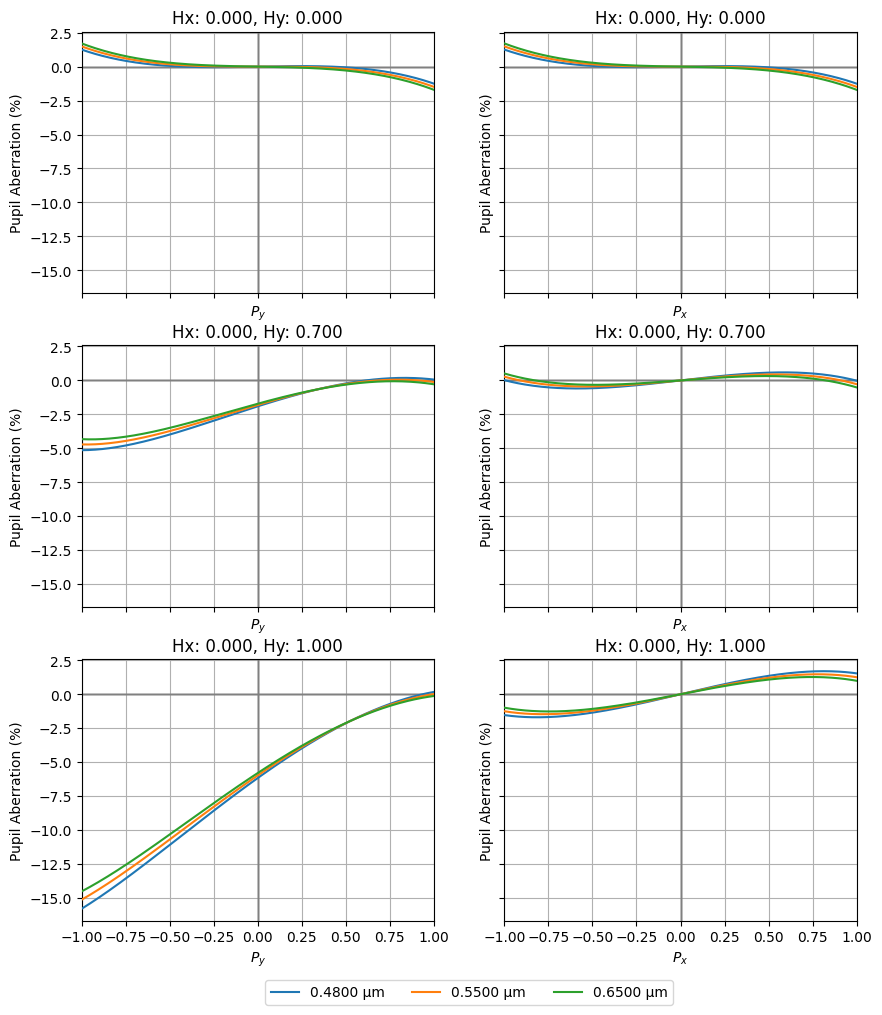 lensobject, then call.view()— making the API consistent and easy to remember. - The YYbar diagram and distortion plots reveal field-dependent behavior, while the field curvature and pupil aberration plots highlight residual Seidel terms across the pupil.