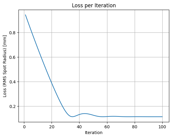 f"Loss (RMS Spot Radius): {loss.item():.6f} mm"