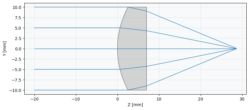 This tutorial shows how even aspheres can be modeled in Optiland. We will first assess a simple spherical lens, then compare it to an even asphere.
