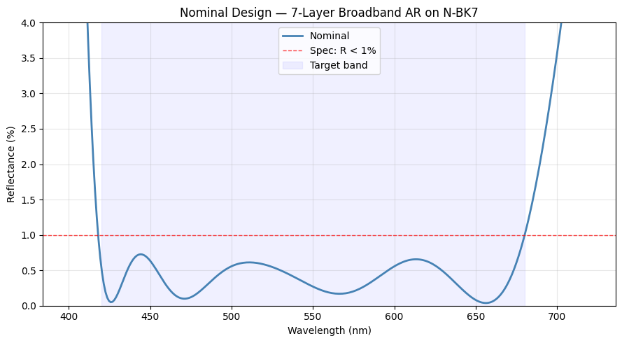 ax.set_title("Nominal Design — 7-Layer Broadband AR on N-BK7")