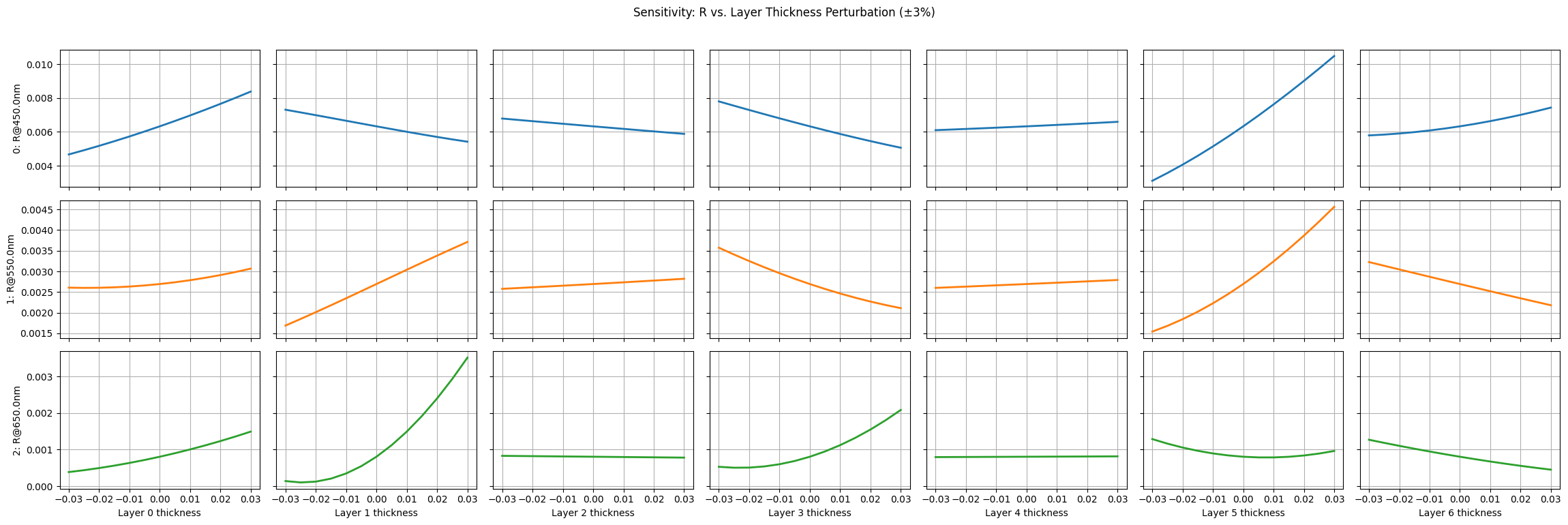 - The sensitivity analysis reveals which layers dominate the error budget — steep curves mean tight thickness control is needed on that layer.
