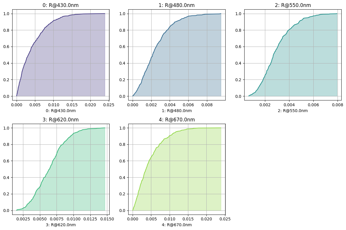 Read off yield from the CDF: e.g., what fraction of parts will have R < 1% at each wavelength?