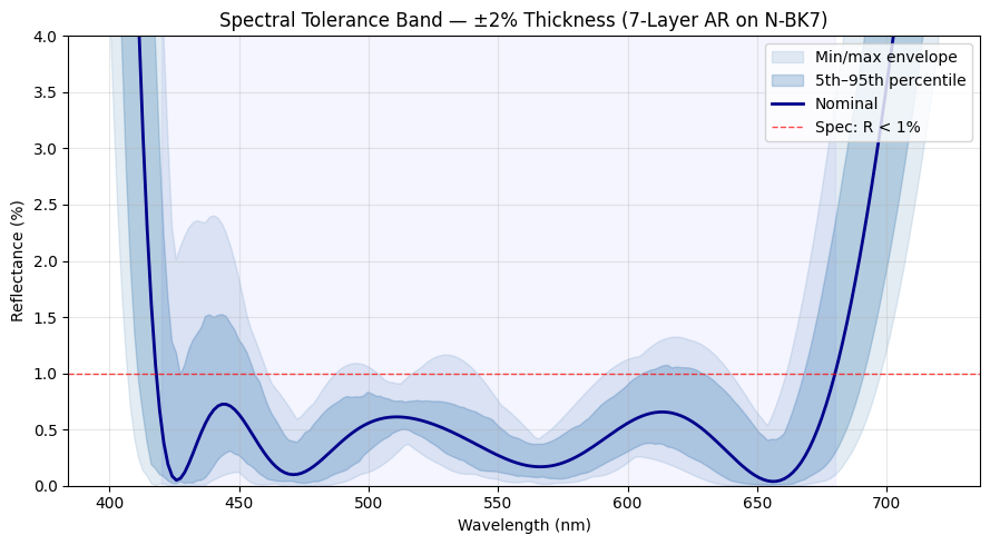 - The spectral tolerance band shows the full range of reflectance spectra under manufacturing variations. Where the max envelope crosses the 1% spec line indicates the wavelengths most at risk.