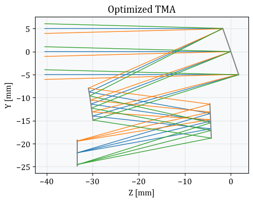 - A three-mirror anastigmat (TMA) telescope was constructed using three tilted and decentered freeform (Zernike) mirror surfaces, demonstrating Optiland's support for all-reflective, off-axis optical systems.