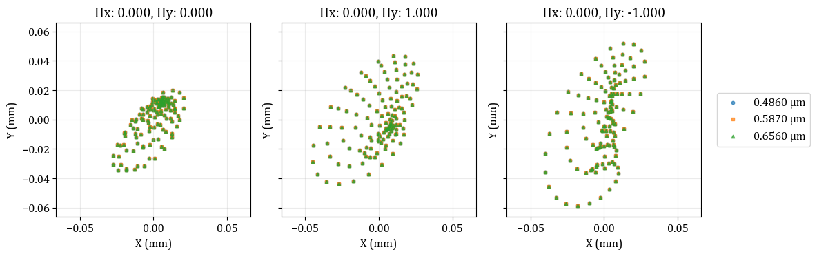 real_y_intercept_lcsoperand was used to center each mirror and the image surface on their respective chief rays in the local coordinate frame, a technique that is essential for unobscured reflective geometries. - After optimization, the spot diagram showed a dramatic reduction in aberrations across all three field angles, confirming that the freeform coefficients effectively corrected off-axis coma and astigmatism.