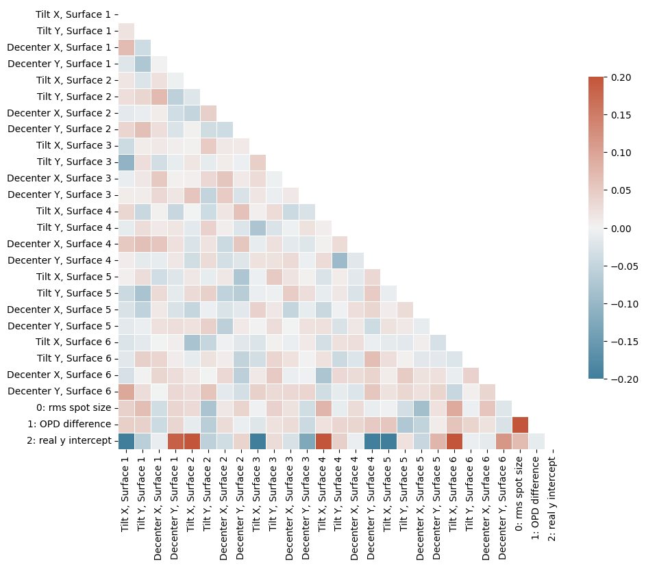 The heatmap gives an indication of the correlation between the metrics and the various pertrurbations applied. The strongest correlations exist between the real y-intercept and several of the surface tilts and decenters.
