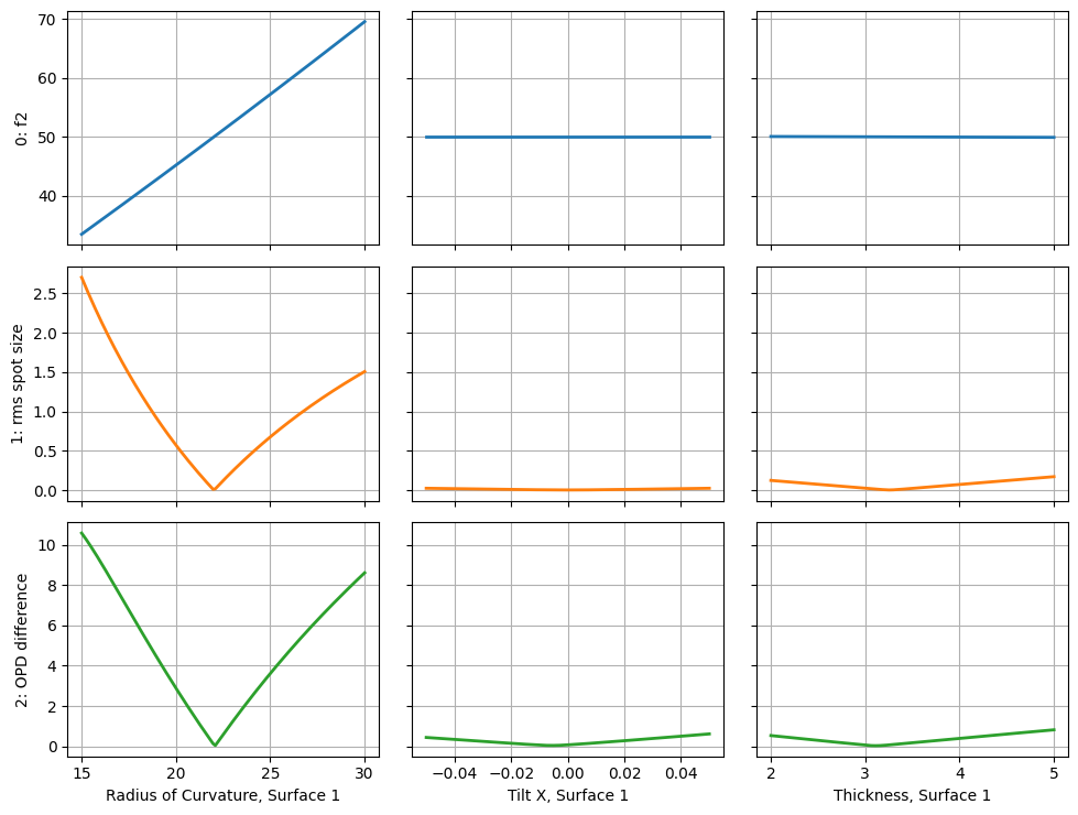 In this example, we will apply various perturbations to our optic, one at a time, while monitoring various metrics, or operands. We will perform a sensitivity analysis, which will show the variation in each metric (operand) as a function of each perturbation. In this case, all perturbations are applied independently.