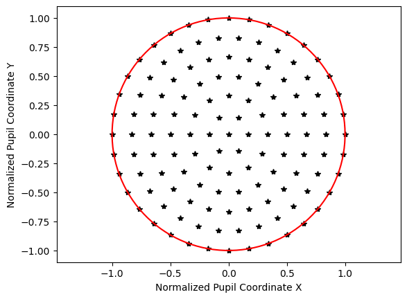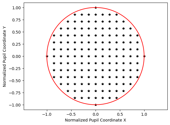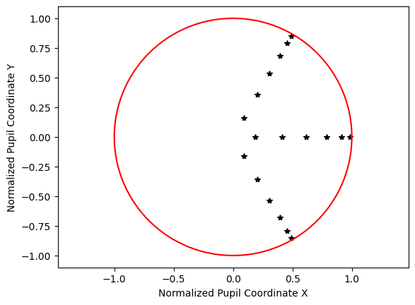 The next distribution is the Gaussian qaudrature, which is an optimized grid for lens design based on the following paper. Essentially, this grid probes the pupil in such a way so as to accurately determine the wavefront while minimizing the number of rays traced.