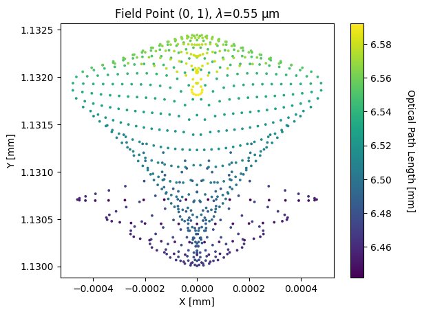 Retrace a hexapolar grid at 100% field and color each ray by its optical path length. This reveals the wavefront structure across the pupil.